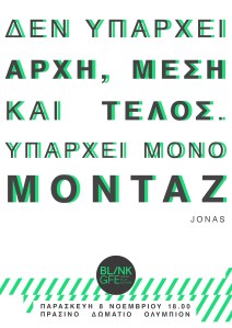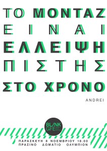 Ήταν το Νοέμβριο του 2021, κατά τη διάρκεια του μεγάλου αφιερώματος του Φεστιβάλ στο Μοντάζ, όταν προέκυψε για πρώτη φορά η ιδέα μιας ένωσης μοντέρ στην Ελλάδα. Το Νοέμβρη του ’23 έγινε η πρώτη μαζική συνάντηση μοντέρ και τρεις μήνες μετά ιδρύθηκε και επίσημα η Blink Greek Film Editors μέσα από τη σύμπραξη 51 μοντέρ και κόλοριστ που δραστηριοποιούνται στον κινηματογραφο, τη διαφήμιση και την τηλεόραση και έκτοτε δεν έχει σταματήσει να μεγαλώνει.